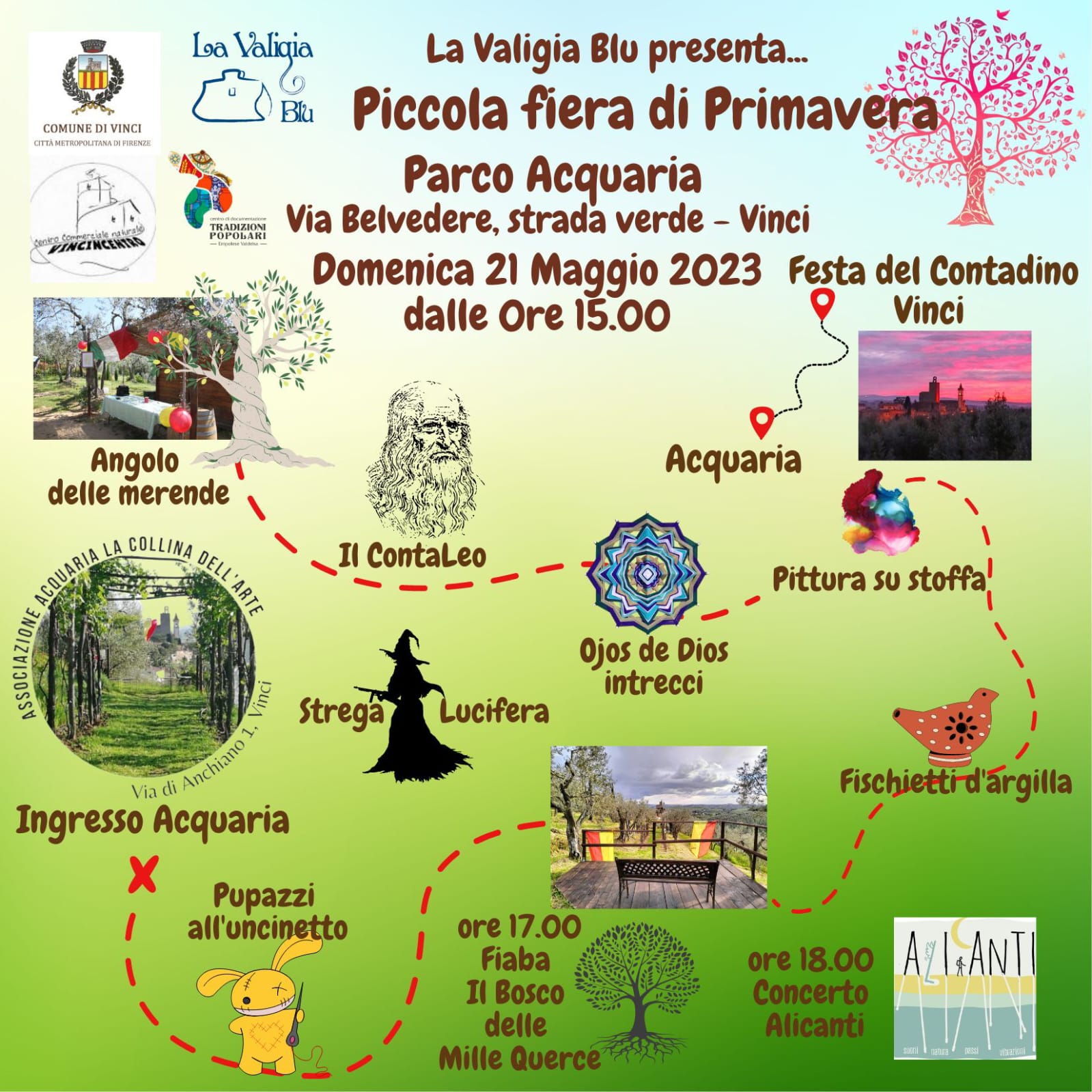 Un intero pomeriggio immersi nella natura del Parco Acquaria di Vinci con  Laboratori di Attività Manuale a cura di Lucilla Morosi, Sarah Bertelli, Sara Bracci, Franca Fattini, Concerto di Musica Popolare con AliCanti, Fiaba di tradizione popolare Il Bosco delle Mille Querce a cura di Katia Frese, Alice Ulivi e Serena Bartalucci, un'insolita Strega che si aggira per il Parco, Il ContaLeo che ci racconterà i segreti celati nei disegni di Leonardo Da Vinci.Punto ristoro a cura di Fabrizio Ferrali e tanta Natura "Maestra dei Maestri"