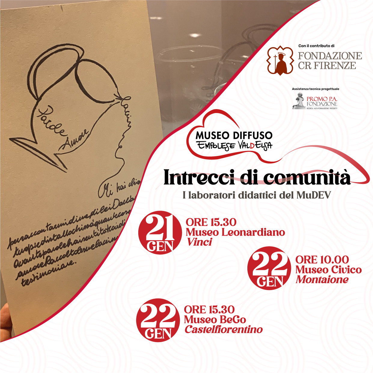 Un ciclo di mediazioni culturali e laboratori dedicati a creare ricordi, produrre legami e trovare se stessi a partire dalla collezioni museali del Museo Diffuso Empolese Valdensa. Un viaggio a più tappe per prendere coscienza del museo come spazio di comunità in cui ritrovare anche la propria storia personale.