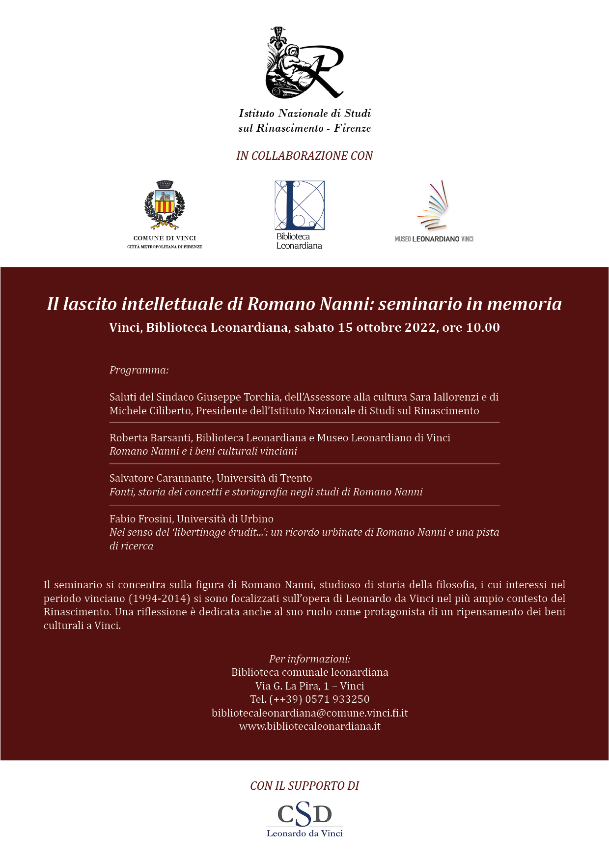 Vinci, un seminario in memoria di Romano Nanni e dei suoi studi su Leonardo
