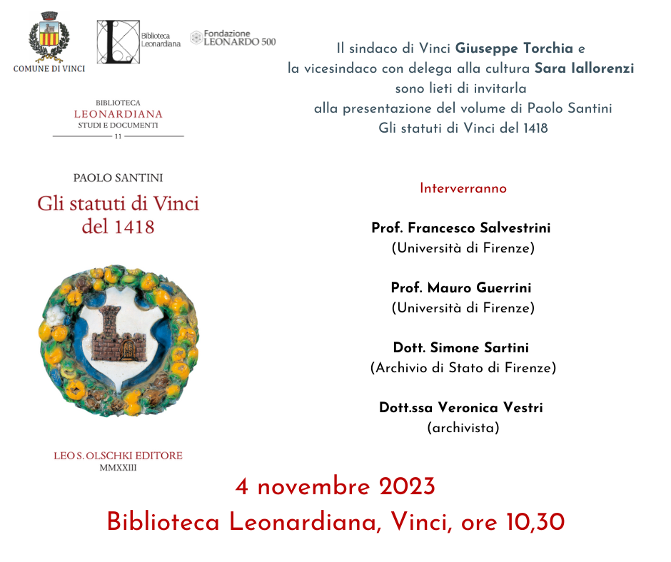Sabato 4 novembre alle 10,30 in Biblioteca Leonardiana a Vinci sarà presentato il volume “Gli statuti di Vinci del 1418”.