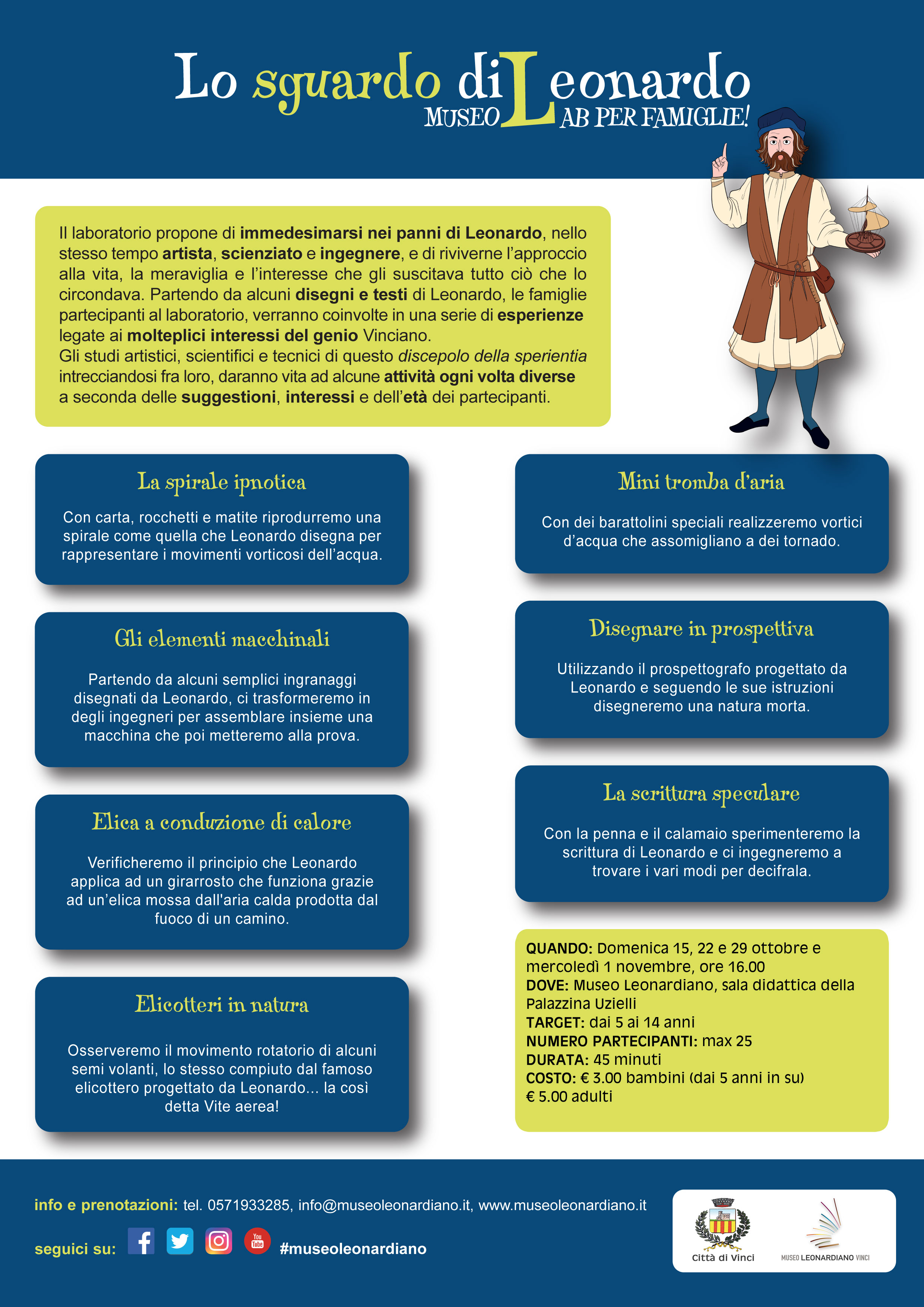 Partendo da alcuni disegni e testi di Leonardo, le famiglie partecipanti al laboratorio, verranno coinvolte in una serie di esperienze legate ai molteplici interessi del genio Vinciano capaci di stimolare quella curiosità e quello spirito di osservazione proprio degli uomini del Rinascimento.
