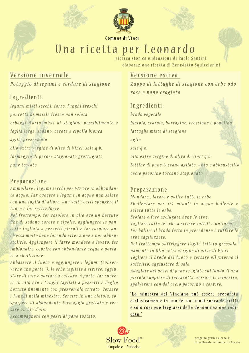 La minestra del Vinciano nasce in occasione delle Celebrazioni per i 500 anni dalla morte di Leonardo da Vinci. La ricetta è stata realizzata attraverso l’attenta e puntuale ricerca archivistica sulle coltivazioni nei campi dell’epoca. Negli statuti di Vinci del 1418 si invitava il popolo a coltivare l’orto e produrre erbaggi di stagione, al fine di avere garantito un nutrimento sano e ricco di sostanza, in modo da poter combattere malattie, epidemie e rimanere in forza per poter lavorare nei campi. Quelli che oggi vengono comunemente chiamati piatti poveri come zuppe, minestre e polente, un tempo erano la fonte principale di sostentamento.