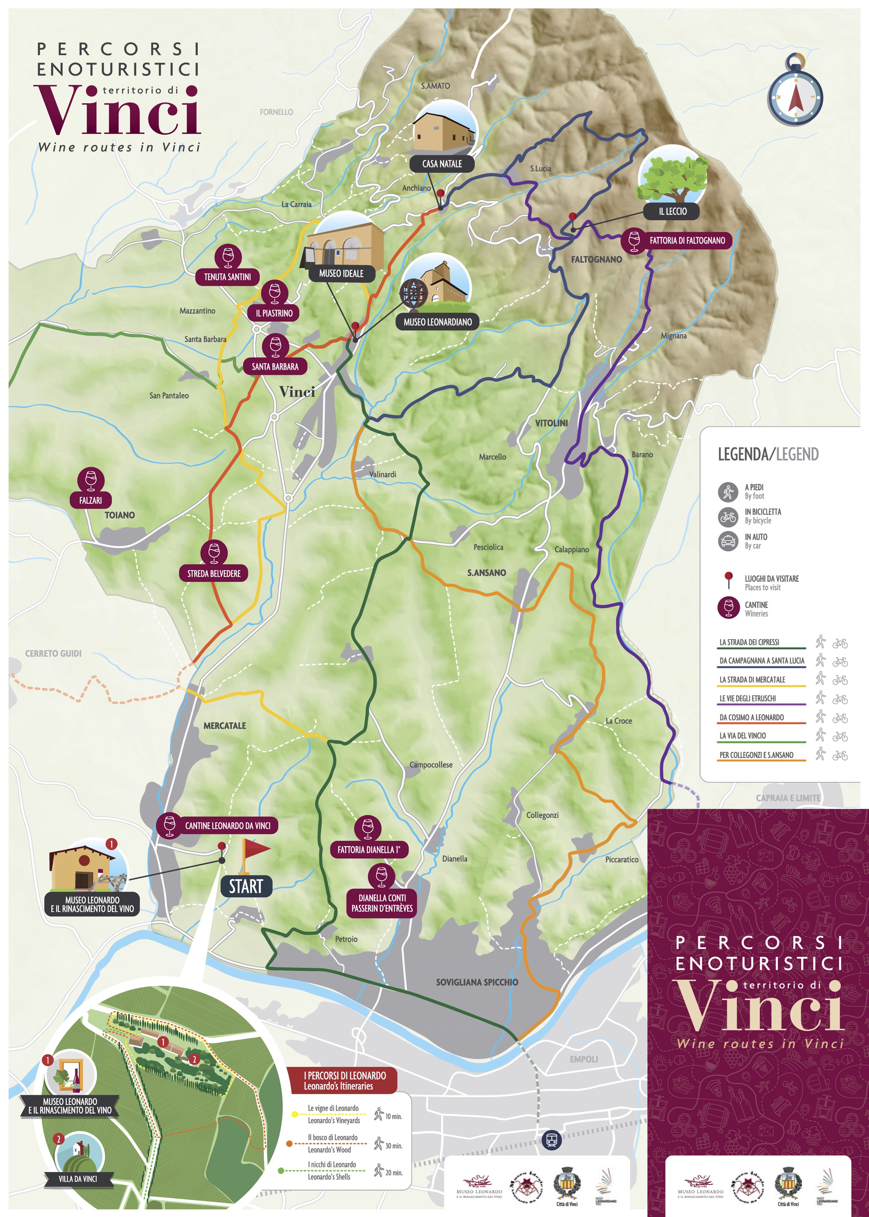Il dolce paesaggio collinare di Vinci regala un’ottima produzione agroalimentare del vino e l’olio d’oliva, frutti antichi e al tempo stesso emblema della Toscana, ai quali è dedicata la “Strada dell’olio e del vino del Montalbano Le Colline di Leonardo”.  Il paesaggio agricolo, pressoché intatto, è caratterizzato dalla coltivazione della vite sulle colline più morbide e basse e dall’ estensione degli oliveti sulle pendici più alte, soprattutto nell’ area del Montalbano.